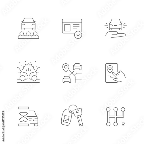 Car sharing thin line icons set of driver's license, key, blocked car, pointer, available, searching of car. Vector illustration.