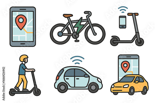 Line style icons of scooter sharing: unlock app icon, helmet reminder, geofence line, charge hub, park dock icon, scooter trail map, brake check, shared ride rule tag.