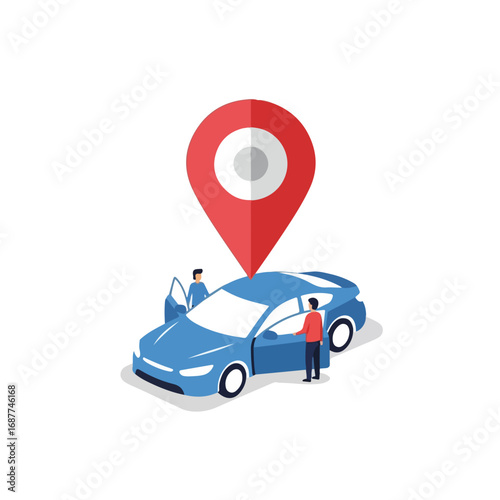 Car with map pointer graphic icon. Rent a car sign isolated on white background. Symbol of car sharing. Vector illustration