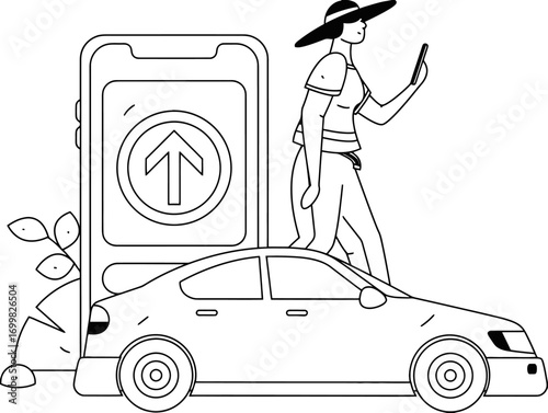 Online taxi ordering application concept. Call a taxi by using mobile app. Woman standing near smartphone screen with navigation map and location pin and ordering taxi, vector illustration