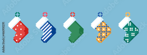 Pixel art Christmas socks collection. Set of 8 bit video game decoration stocking elements. Christmas red, blue, green gift socks. Vector isolated vintage icons.