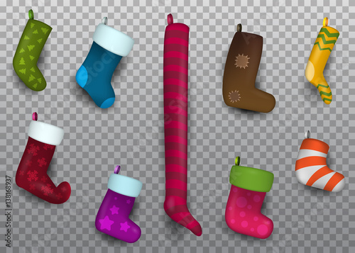 Christmas stocking set isolated on white background. Holiday Santa Claus winter socks for gifts. Cartoon decorated present sock. Vector.