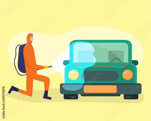 Interior disinfection. Sanitary treatment of room against viruses. Men doing professional antibacterial cleaning. Disinfector spraying chemicals. Pandemic prevention. Vector concept