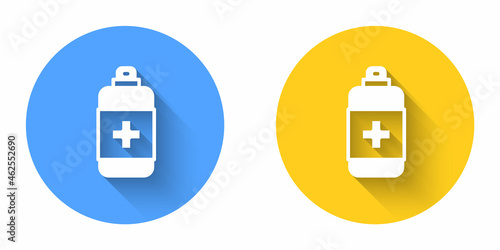 White Bottle of liquid antibacterial soap with dispenser icon isolated with long shadow background. Antiseptic. Disinfection, hygiene, skin care. Circle button. Vector