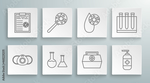 Set line Medical protective mask, Test tube and flask, First aid kit, Bottle of liquid antibacterial soap, Blood test virus, and Clipboard with blood results icon. Vector