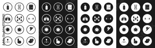 Set Clipboard with blood test results, Virus spread, cells in lung, Bottle of liquid antibacterial soap, Safe distance, DNA symbol, Syringe and virus and icon. Vector