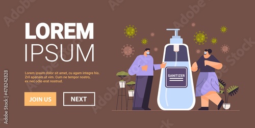 people in masks applying antibacterial spray disinfection against virus bacteria stop coronavirus use hand sanitizer