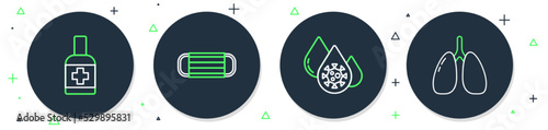 Set line Medical protective mask, Blood test and virus, Liquid antibacterial soap and Lungs icon. Vector
