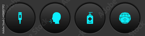 Set Medical thermometer, Man coughing, Liquid antibacterial soap and Earth with medical mask icon. Vector.