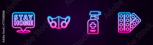 Set line Stay home, Medical protective mask, Liquid antibacterial soap and Pills in blister pack. Glowing neon icon. Vector