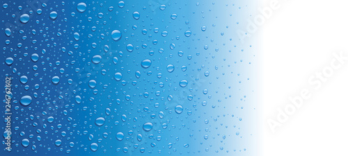 eps 10 vector pure water drops isolated on blue background. Realistic rain drops, dew on glass or window. Clear droplets set for web, print. Closeup illustration. Graphic clip art. Editable backdrop
