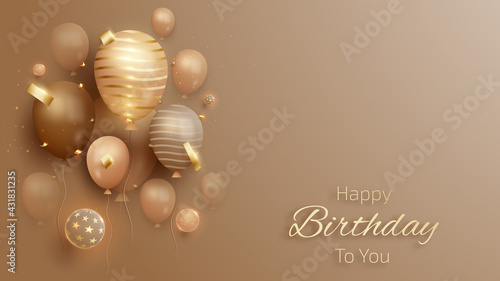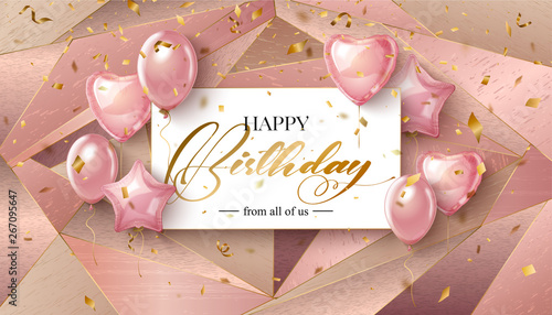 Realistic happy birthday banner with gold, pink and white balloons and confetti falling on a rose colored background. Suitable for greeting cards, posters, templates