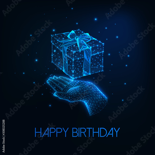 Futuristic happy birthday greeting card with glowing low polygonal human hand holding gift box