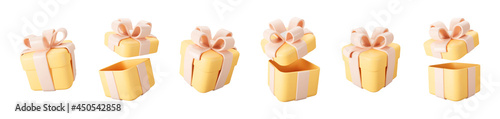 3d orange gift boxes open and closed set with pastel ribbon bow isolated on a white background. 3d render flying modern holiday surprise box. Realistic vector icon for birthday or wedding banners