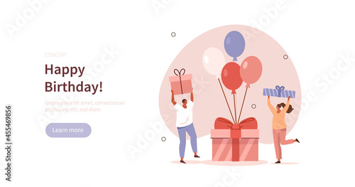 People celebrating birthday party. Characters standing near birthday gift box and balloons. Happy birthday concept. Flat cartoon vector illustration and icon set.