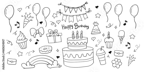 Birthday doodle icon element. Hand drawn sketch doodle birthday cake, balloon, event decoration element. Party, carnival celebration concept background. Vector illustration