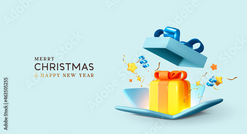 Merry Christmas and Happy New Year. Background with realistic 3d festive blue open gifts box. Xmas sale present. Holiday decorative yellow boxes, Holiday gift surprise. Vector illustration