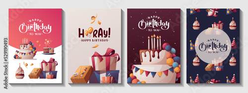 Set of Birthday cards with cake, gift boxes, cupcake. Handwritten lettering. Birthday party, celebration, congratulations, invitation concept. Vector illustration. Postcard, card, cover.