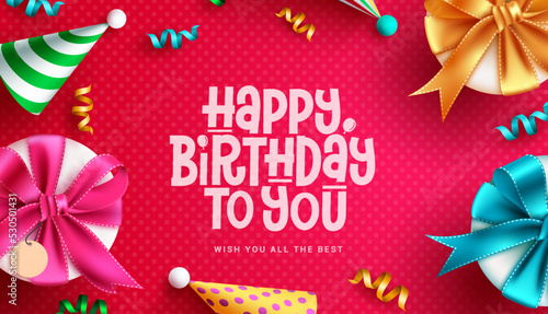 Birthday greeting vector background design. Happy birthday to you text with gifts pennants and gold party hat decoration elements for birth day celebration messages. Vector illustration.