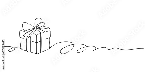 Gift box one line drawing. Continuous one line gift box.Presents with ribbon bow.Hand drawn greeting present box.Line art christmas surprise.