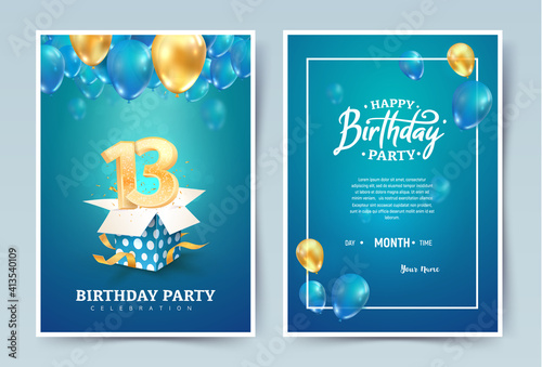 13th years birthday vector invitation double card. Thirteen years anniversary celebration brochure. Template of invitational for print on blue background