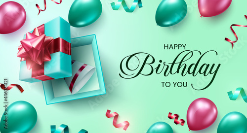 Happy birthday vector background design. Happy birthday to you greeting text with balloons and surprise gift box elements for birth day party celebration card design. Vector illustration
