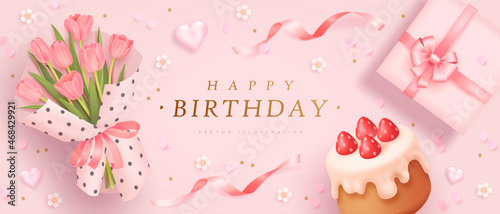 Happy birthday horizontal banner with realistic bouquet of tulips, cake and gift box. 3d realistic style. Vector illustration