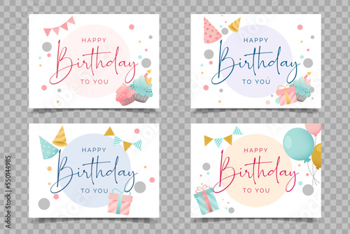 Set of birthday postcards with  confetti, balloons, cocktail, cake and hand writing. Invitations, happy birthday. Vector templates great for card, poster, flyer or banner