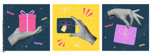 Set of retro greeting cards with cut out hand holding gift boxes. Template for birthday card, invitation, social media, flyer, banner, poster. Vector illustration