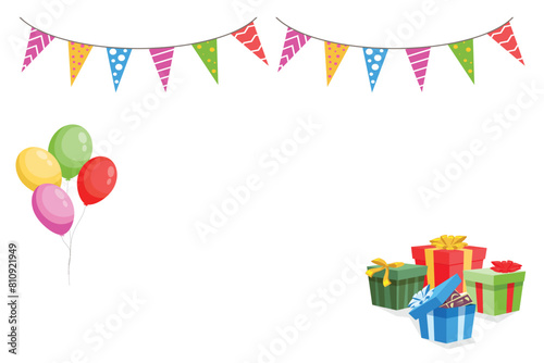 Happy birthday background. Holiday banner with balloons, colorful pennants garland and gifts. Kids party greeting card. Cartoon vector poster template for birthday celebration isolated on transparent
