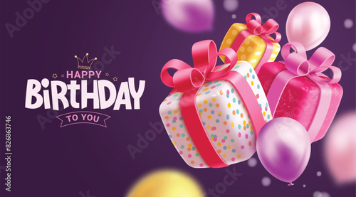 Happy birthday greeting vector design. Birthday greeting text with 3d gift box and balloons decoration elements in purple background. Vector illustration birthday invitation card design.
