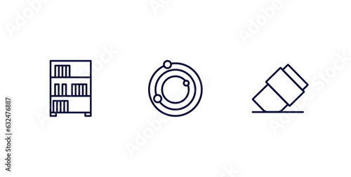 set of education and science thin line icons. education and science outline icons included bookshelf with books, atomic orbitals, eraser vector.
