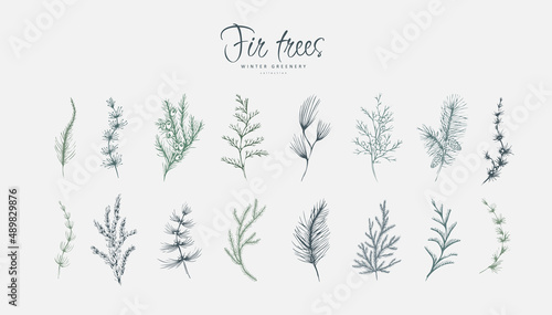 Christmas spruce branch set. Larch, Pine, spruce branch, evergreen tree, fir, vector icon, winter plants, New Year wood, holiday decoration. Hand drawn illustration.