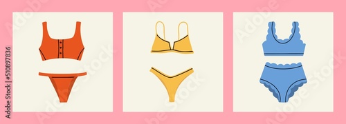 Summer isolated fashion items. Minimalistic simplified vector illustration. Different types of swimwear for the beach.