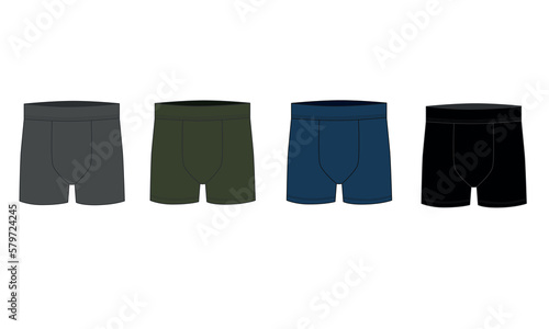 Men's boxer briefs fashion flat sketch, underwear technical drawing, front and back view, vector template, stretch fabric design, apparel
