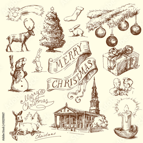 Christmas hand drawn vector illustration set. Festive holiday elements isolated hand drawn clipart christmas theme. sled, deer, santa, gifts and more. for graphic design projects and celebrations.