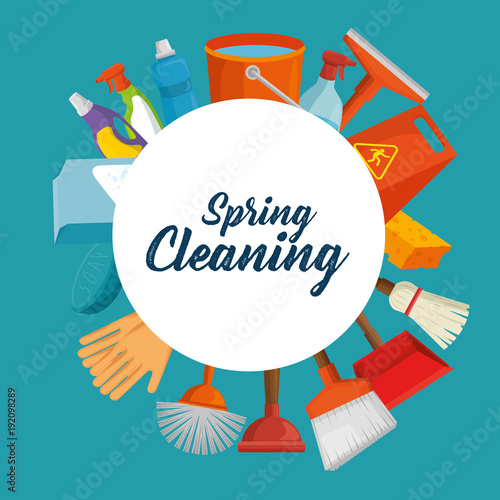 Cute set of spring cleaning utensils background in vivid eye catching colors
