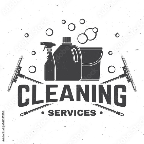 Cleaning company badge, emblem. Vector illustration. Concept for shirt, stamp or tee. Vintage typography design with cleaning equipments. Cleaning service sign for company related business