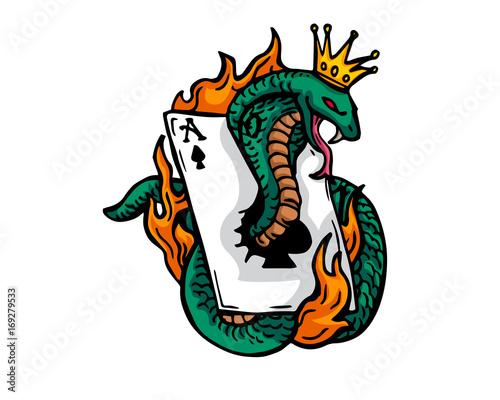 Vintage Tattoo Art Illustration - Flaming Gambling King Cobra