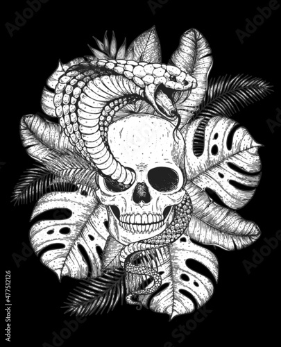 Skull, cobra snake and palm leaves hand drawn illustration. Tattoo vintage print. Hand drawn floral print. Tattoo design. Jungle print. Tropical illustration.