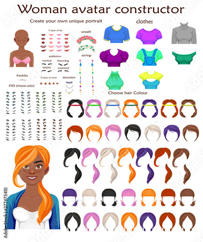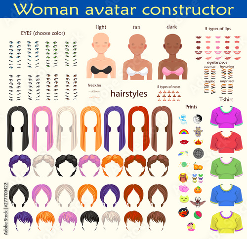 Female face kit. Woman character avatar constructor with hair, eyes and lips. Face shape with various hairstyle. Eyebrows or nose editor mockup. Vector elements set for portrait creation