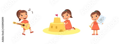Little cute girl builds a sandcastle, drawings, plays the guitar and sings. Creativity concept. Сhild is having fun and relaxing. Cartoon characters, set of flat vector illustrations