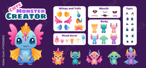 Create your Monster and collect cute aliens and funny creatures. Cartoon character creation kit with all elements and body parts. Vector children illustration
