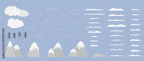 Cute vector collection of winter elements for hand drawn map. Snowy mountains, snow, snowfall, clouds, swirls, wind.