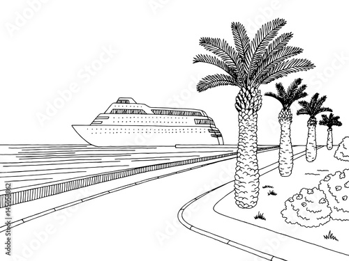 illustration of cruise ship in sea, front view, near beach, palm trees