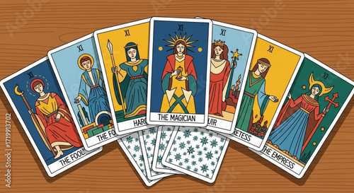 Tarot cards set. Fortune telling, divination by esoterics, zodiacs and astrology. Designs of backs with hands, spiritual crystal, magic arcana of swords, cups, pentacles. Flat vector illustrations
