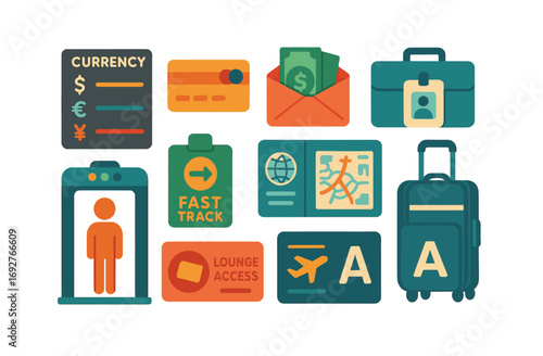 air travel icon set. luggage and flight ticket. vacation and trip symbols. isolated vector images for tourism design