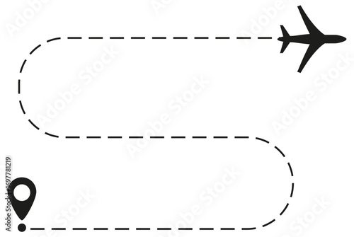 Airplane line path route travel vector concept. Plane routes dotted paths aircraft travel route start point flight destination black airplane. Plane, airplane, Aeroplane, flight, airline.