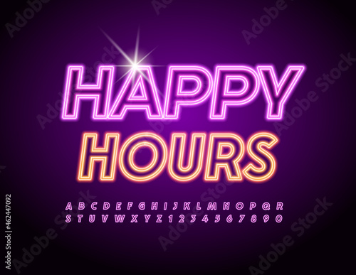 Vector colorful Banner Happy Hours. Glowing modern Font. Electric light Alphabet Letters and Numbers set