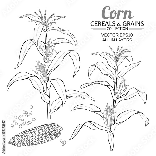 Sketch of corn contour drawing isolated on white background, stock vector illustration, for design and decoration, sticker, template, vintage, banner, vegetables